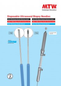 detailed information Disposable Ultrasound Biopsy Needles EUS-FNB-Biopsy Needle (Stainless steel) EUS-FNA-Biopsy Needle (Stainless steel) EBUS-TBNB-Biopsy Needle (Stainless steel) EBUS-TBNA-Biopsy Needle (Stainless steel) EUS-FNB-Biopsy Needle (Nitinol) EUS-FNA-Biopsy Needle (Nitinol) • Optimal visibility of the cannula thanks to the “hole structure” below the needle tip • Kink-resistant Nitinol mandrel • Smooth-running, kink-resistant plastic insertion tube • Highly flexible, kink-resistant variants: stainless steel & 100% Nitinol needles Articel no. Description Needle Need- S U P M Y L O M L I F I J U F X A T N E P S U P M Y L O M L I F I J U F UN-A-19-11-80-16-1375 FNA Stainless steel EUS UN-A-22-07-80-16-1375 FNA Stainless steel EUS UN-B-22-07-80-16-1375 FNA Stainless steel EUS UN-B-22-07-80-22-1375 FNA Stainless steel EUS UN-D-22-07-80-16-1375 FNB Nitinol EUS UN-C-22-07-80-16-1375 FNA Nitinol EUS UN-D-22-07-80-22-1375 FNB Nitinol EUS UN-A-19-11-50-16-715 EBUS-TBNA, Stainless steel UN-A-22-07-50-16-715 EBUS-TBNA, Stainless steel UN-B-22-07-50-16-715 EBUS-TBNB, Stainless steel UN-C-19-11-50-16-715 EBUS-TBNA, Nitinol UN-C-22-07-50-16-715 EBUS-TBNA, Nitinol UN-D-22-07-50-16-715 EBUS-TBNB, Nitinol X A T N E P UN-A-22-07-50-16-670 EBUS-TBNA, Stainless steel UN-A-19-11-50-16-670 EBUS-TBNA, Stainless steel UN-B-22-07-50-16-670 EBUS-TBNB, Stainless steel FNA FNA FNB FNB FNB FNA FNB FNA FNA FNB FNA FNA FNB FNA FNA FNB Ø Gauge 19 22 22 22 22 22 22 19 22 22 19 22 22 22 19 22 le mm 1,1 0,7 0,7 0,7 0,7 0,7 0,7 1,1 0,7 0,7 1,1 0,7 0,7 0,7 1,1 0,7 Ø mm Length PU mm 1,6 1,6 1,6 2,2 1,6 1,6 2,2 1,6 1,6 1,6 1,6 1,6 1,6 1,6 1,6 1,6 1375 1375 1375 1375 1375 1375 1375 715 715 715 715 715 715 670 670 670 1 1 1 1 1 1 1 1 1 1 1 1 1 1 1 1 We reserve the right to make technical changes and to deviate from the depicted images. TW-Endoskopie W. Haag KG I Goldsbergstraße 18 I D-46487 Wesel I Germany Phone +49 2803 9120-0 I info@mtw-endoskopie.com I www.mtw-endoskopie.com B G 6 2 0 2 . 4 0 / 9 7 1 2 : . o N - . g e R